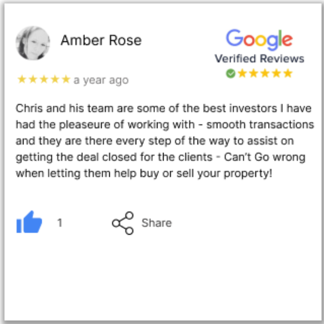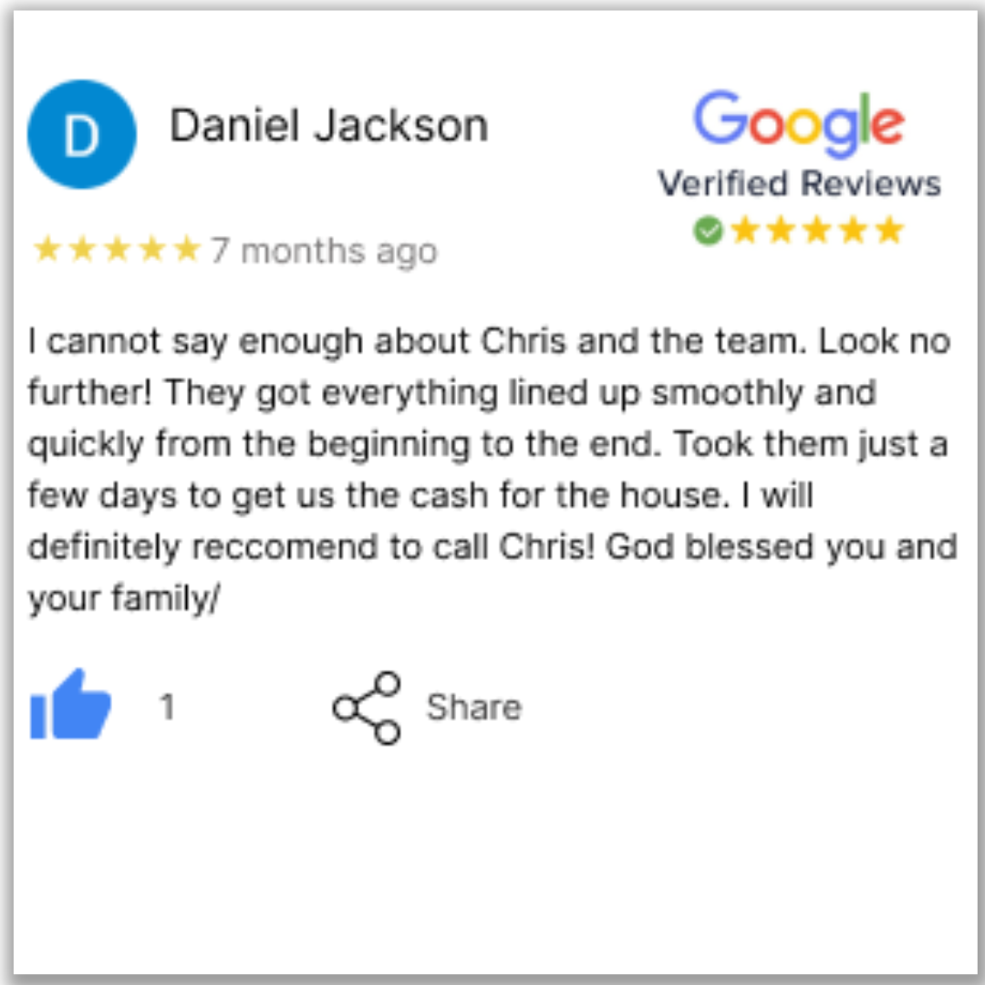 “I cannot say enough about Chris and the team. Look no further! They got everything lined up smoothly and quickly from the beginning to the end. Took them just a few days to get us the cash for the house. I will definitely recommend to call Chris. God blessed you and your family.”